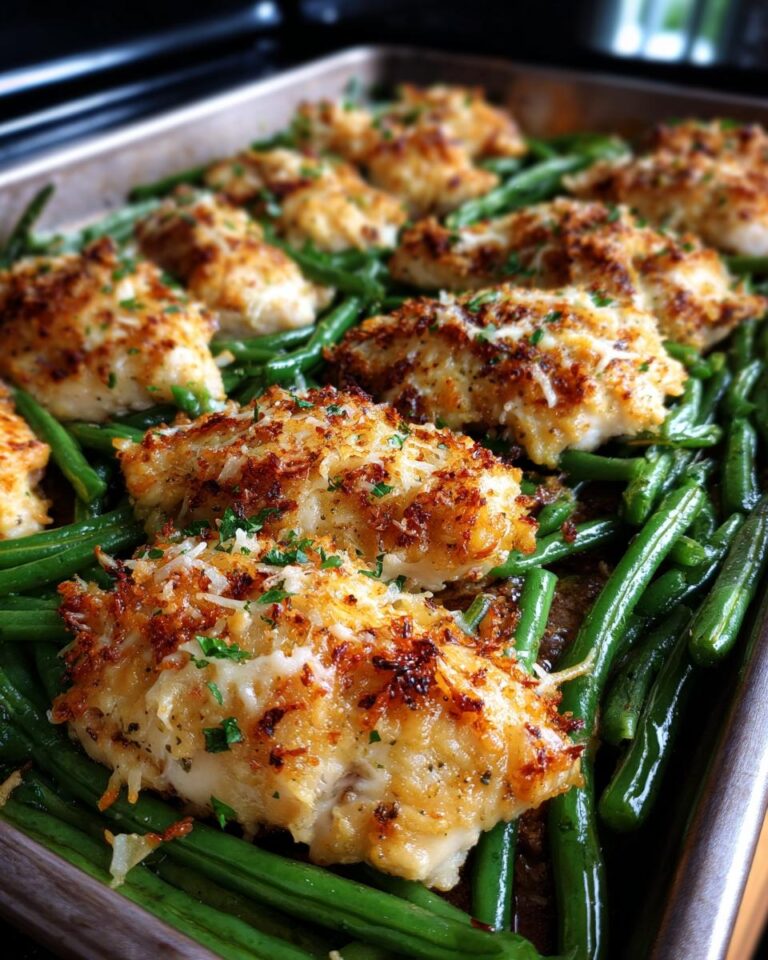 A simple and flavorful sheet pan dinner featuring chicken and green beans baked with garlic and Parmesan cheese.