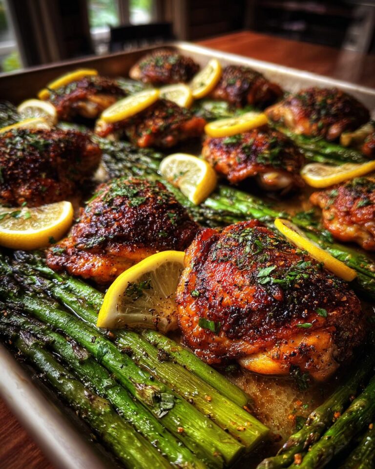 A simple and healthy sheet pan dinner featuring lemon herb marinated chicken and fresh asparagus, all roasted to perfection for a quick and delicious meal.
